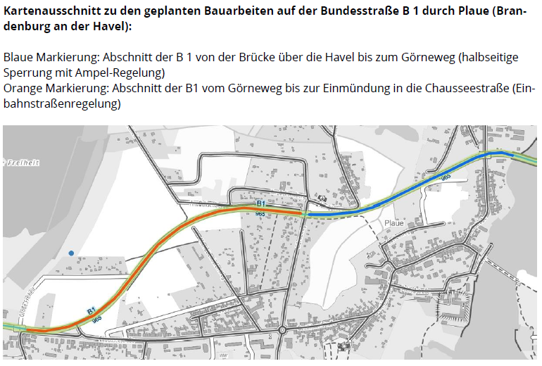 - Erschienen amDer Landesbetrieb Straßenwesen plant von Mitte März bis Mitte Juni 2026 die Fahrbahn der Bundesstraße B 1 durch Plaue (Brandenburg an der Havel) zu sanieren.
